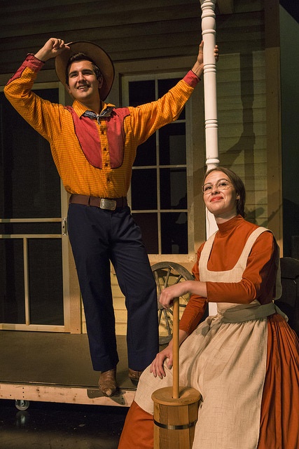 The delivery of the story’s scenes rely more on slapstick than suspense, combined with wink-to-the-audience use of stagecraft, where chairs become cars; trunks become trains; curtains and windowshades just hang in midair where needed; and a supporting actor inhabiting two roles slyly converses with himself.